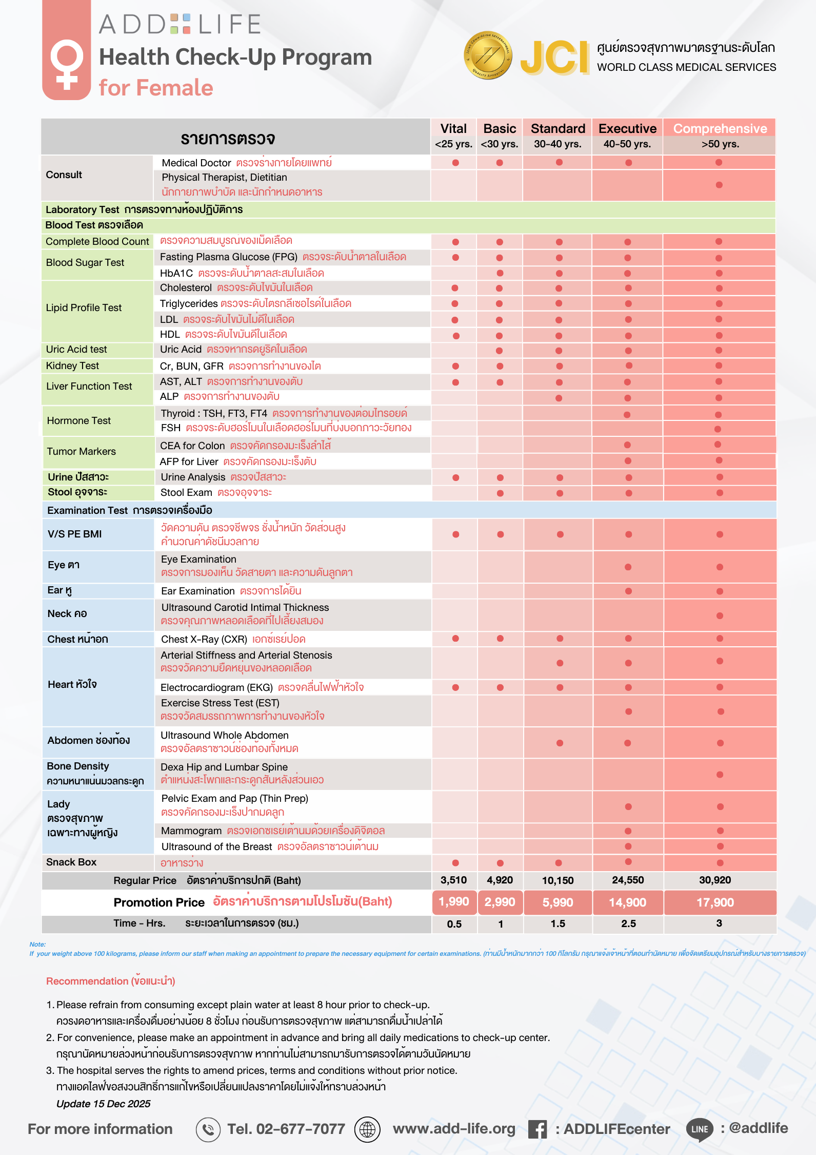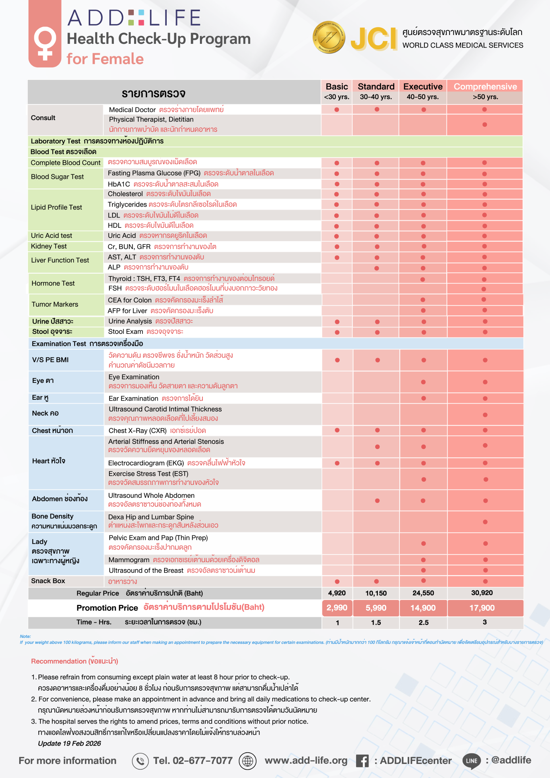 ProgramsHealth Check-Up Packages At ADDLIFE, BangkokLady’s Health Check-Up Program Services Menu Health Check-Up Packages At ADDLIFE, Bangkok Lady’s Health Check-Up Program Men’s Health Check-Up Program Premium Health Check-Up Program Ultimate Health Check-Up Program Ultimate Plus Health Check-Up Program Advanced Check-Up Programs Advanced Heart Check-Up Program Advanced Brain Check-Up Program Advanced Cancer Program Screening Equipment Magnetic Resonance Imaging (MRI) CT Scan Ultrasound X-Ray Mammogram DEXA Scan Electrocardiograph EKG Echocardiogram Exercise Stress Test (EST) Arterial Stiffness Measurement (Vascular Screening) Fibroscan Lady’s Health Check-Up Program Back to Programs See which program works best for you Consult Us